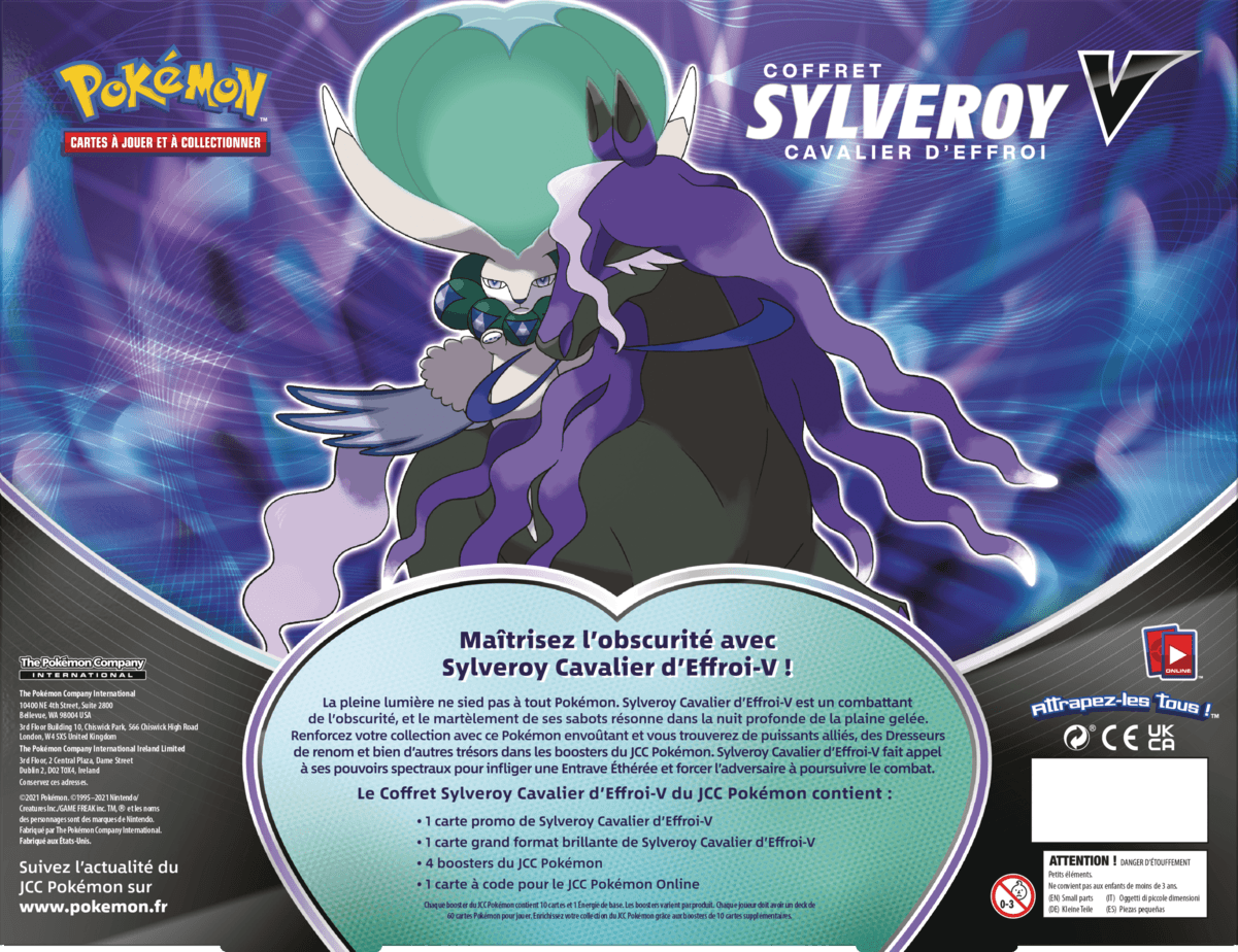 ¡Domina las tierras nevadas y la oscuridad con las dos formas de Sylveroy-V! Sylveroy-V combina dos tipos de poder y galopa a través del hielo y las sombras sobre su fiel corcel. Refuerza tu colección con este Pokémon real y consigue poderosos aliados, entrenadores de renombre y muchos otros tesoros en los Boosters Pokémon CCG. Tanto si eliges a Sylveroy Jinete del Frío-V como a Sylveroy Jinete del Terror-V, añadirás un poderoso Pokémon legendario a tu colección.